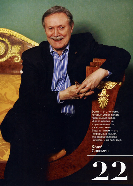 Юрий Соломин наследует стиль игры, которому он научился у мастеров сцены, в классе великой русской актрисы Веры Николаевны Пашенной. Он учился, восхищаясь манерами тех, кто находил вдохновение в прошлом. Старина стала для него чем-то сакральным. Она воспринимается как какой-то недостижимый и лучший мир, относительно которого выстраивается вертикаль добра и зла, понимание актерского мастерства.