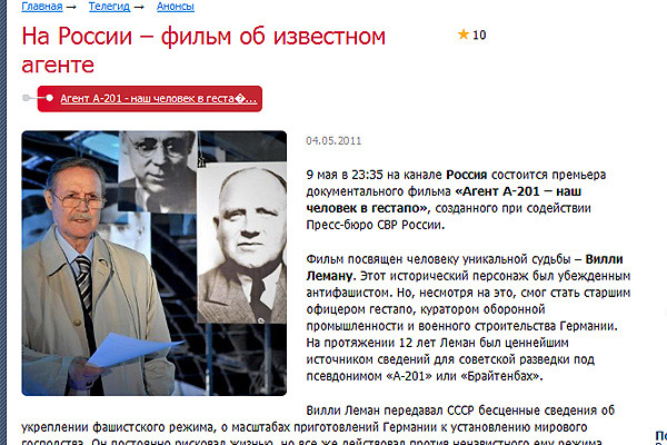9 мая в 23:35 на канале Россия состоится премьера документального фильма «Агент А-201 – наш человек в гестапо», созданного при содействии Пресс-бюро СВР России. В фильме снялся народный артист СССР Юрий Мефодьевич Соломин.