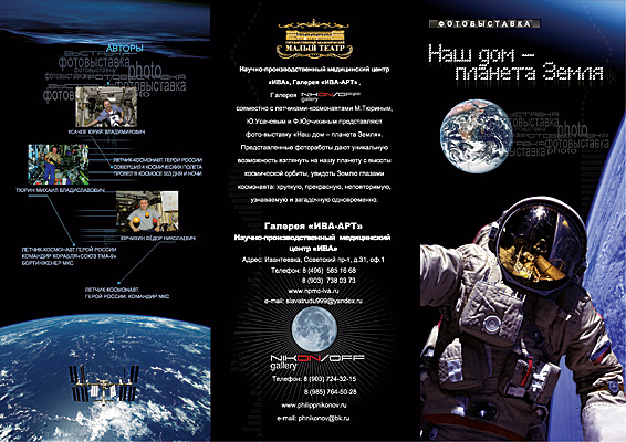 NIKON/OFF совместно с летчиками-космонавтами М.Тюриным, Ю.Усачевым и Ф.Юрчихиным представляют фотовыставку «Наш дом - планета Земля». Представленные фотоработы дают уникальную возможность взглянуть на нашу планету с высоты космической орбиты, увидеть Землю глазами космонавта: хрупкую, прекрасную, неповторимую, узнаваемую и загадочную одновременно.