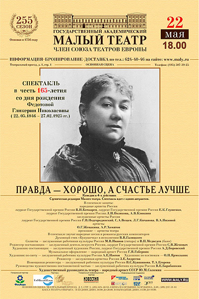 22 мая спектакль «Правда – хорошо, а счастье лучше» А.Н.Островского Малый театр посвящает памяти легендарной актрисы, ученицы М.С.Щепкина, заслуженной артистки Императорских театров, народной артистки Республики Гликерии Николаевны Федотовой, 165-летие которой отмечается в этот день.