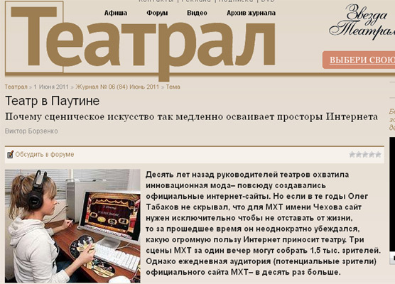 Корреспондент «Театрала» позвонил в дирекцию Хабаровского театра и, представившись местным жителем, поинтересовался: «Почему на вашем сайте нельзя заказать билеты?» Ответ превзошел нормы приличия: «А купить билет в кассе вы уже не можете? Мы что, должны ради вас специального человека на сайт посадить?» И раздались короткие гудки… Несмотря на грубость, ответ оказался весьма показательным: действительно, в большинстве российских театров пополнением сайтов занимается завлит или администратор (хотя для полноценной работы сайта этого отнюдь не достаточно: в МХТ или в Малом театре за интернет-порталом следят целые коллективы).