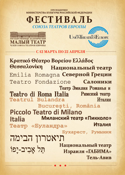 12 марта в 14:00 в Щепкинском фойе Малого театра состоится пресс-конференция, посвященная Фестивалю Союза театров Европы.