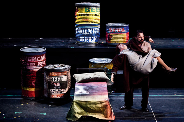 В театре же Иоанна Дарк, великолепная Мария Пайато, не умирает на костре, она погибает от напряжения. Она — героиня тех, кто оказался последними — рабочих закрывающейся мясной фабрики. Ведь это время кризиса 29-го года, фабрика закрывается, потому что ни у кого нет больше денег для покупки этого мяса. Но если у рабочих не будет работы и, следовательно, денег, кто же сможет покупать товары? Рабочий Ронкони – это изображение Джанлуиджи Фогаччи, датированное девятнадцатым веком, повторенное сотни раз на экранах, а также его слова о правах, справедливости, свободе людей, не имеющих права голоса. Чем же этот рабочий отличается от того, который сегодня сражается против партии, занятой великими делами, распределяющей деньги среди тех, у которых их уже предостаточно, являющейся благотворной почвой для коррупции, преступлений, несправедливости? А что же госпожа Лаккерниддл (актриса Франческа Чиоккетти), вдова, попавшего в мясорубку рабочего и превратившегося в консервы? Ее, может, тоже следует упрекать в том, что она отказалась выступить против мясной фабрики взамен двадцати обедов в столовой?