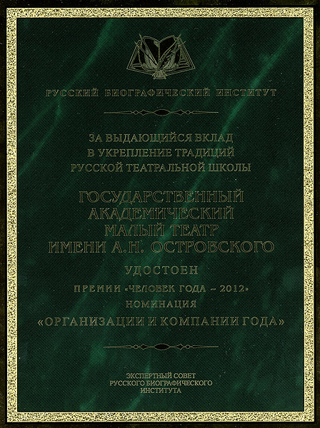 За выдающийся вклад в укрепление традиций русской театральной школы Государственный академический Малый театр удостоен премии «Человек года – 2012» в номинации «Организации и компании года». Премия присуждается «Русским биографическим институтом».