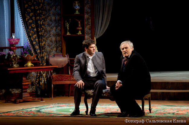 К сценографии здесь, как всегда, подошли с особенным шиком. Декорации тщательно повторяют авторские ремарки. На сценическом круге возник целый дом, в деталях, со всеми мелочами воспроизводящий купеческий быт. Несколько комнат загромождает тяжелая темного дерева мебель, многочисленные абажуры, картины, самовары. В старомодной обстановке чувствуется основательность и надежность. Такой прочности не хватает семье Ванюшиных. Ведь здесь за каждой дверью — подслушивающее ухо, в каждой комнате — свой грязный секрет. Пафоса придает писаный задник, окруживший с трех сторон грешный дом золотыми куполами и крестами. Под аккомпанемент свиридовского духовного хора так и вырисовывается картина масштабной гибели всего старого, доброго, отеческого. Где, как не в Малом, размышлять на эту тему...