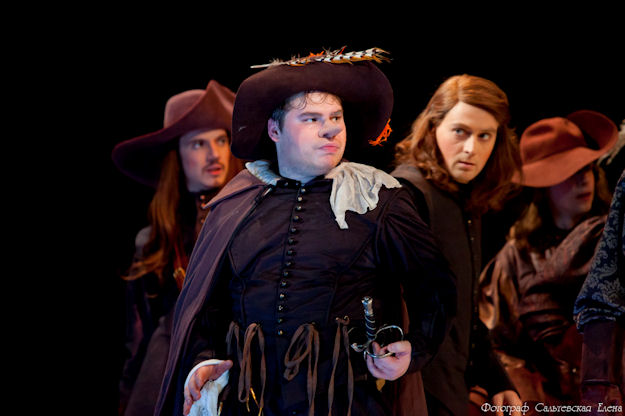 Другое дело, Роксана — весьма спорная работа высокой красавицы Александры Ивановой. Светская кокетка и жеманница остается верна себе и когда хоронит возлюбленного Кристиана, и когда в финале узнает о любви Сирано. Остальные герои сливаются в массовку, существуя в предлагаемых обстоятельствах с разной степенью успеха. Иногда они поют хором бравую гасконскую песню, хотя лучше бы не пели.