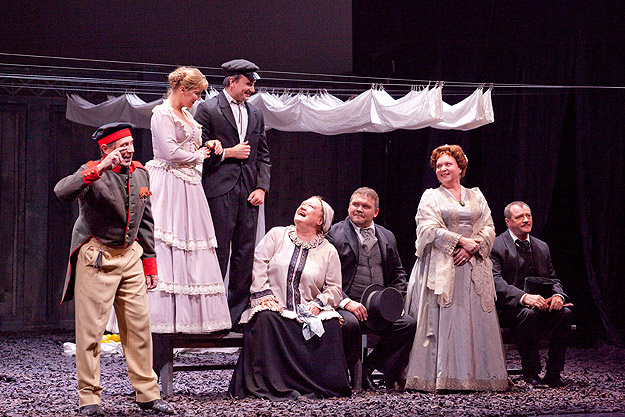 Вот Мавра Тарасовна захотела для важности поставить у ворот унтер-офицера. Героиня Людмилы Поляковой приводит в дом Силу Грознова, с которым купчиха крутила роман в далекой юности, и воспоминания о нем еще не остыли. Грознов – второй «случай». Василий Бочкарев, играющий бывшего военного, появляется как немощный старик, но посмотришь, а он совсем не старик – он парень бравый, он молодцевато закручивает несуществующий ус, он гордо выпячивает грудь, полностью оправдывая свое имя. Своего Грознова артист лепит, пользуясь мельчайшими нюансами, основные из которых – жест и богатая палитра интонаций, которые в данном случае приобретают характерологический смысл. Ключевая сцена спектакля – это встреча унтер-офицера и Мавры Тарасовны в изумительном исполнении Евгении Глушенко. Ее героиня из деспотичной купчихи преображается в нежную, заботливую и любящую даму. Гнев она меняет на милость, ставит на место падкого на удовольствия сына и милостиво разрешает молодым соединиться – их счастье теперь обеспечено. И это преображение составляет особый интерес, равно как и вообще наблюдение над работой занятых в спектакле артистов.