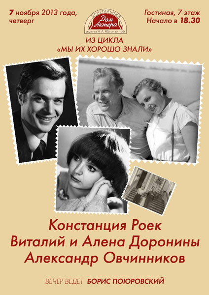 7 ноября в 18:30 в Гостиной на 7-м этаже Дома Актера состоится вечер памяти артистов Малого театра Констанции Роек, Виталия Доронина, Александра Овчинникова и Алёны Дорониной. Ведущий – Борис Поюровский.