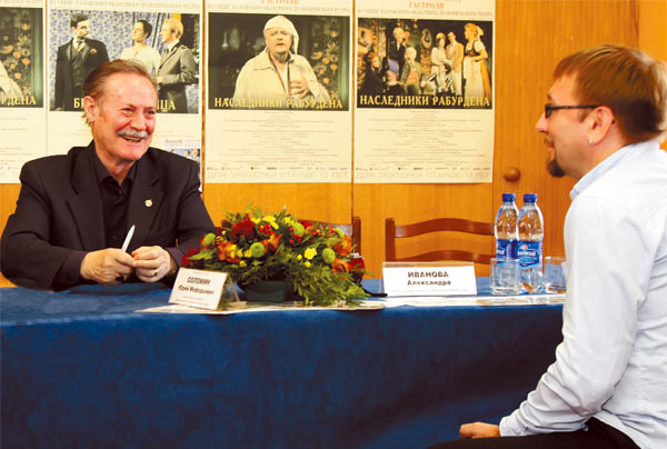 На встречу с журналистами народный артист СССР, художественный руководитель самого главного драматического театра страны пришел в сопровождении трех молодых обаятельных артистов Дмитрия Марина (отдаленно напоминающего молодого Игоря Ильинского), Александры Ивановой и Алексея Фаддеева(очень похожего на Виталия Соломина), как бы подчеркнув тем самым, что самый консервативный театр России не означает — самый древний. А совсем даже наоборот — молодой и свежий. Собственно, как и сам Юрий Мефодьевич. В свои 78 Соломин прекрасно выглядет, подтянут, остроумен! Невольно пришло сравнение с Аленом Делоном. У них во Франции — Делон, а у нас в России — Соломин!
