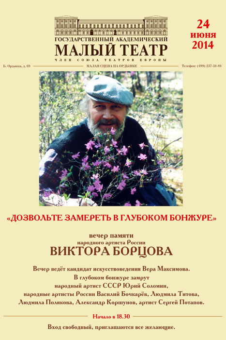 24 июня (Малая сцена на Большой Ордынке) состоится вечер памяти народного артиста России Виктора Андреевича Борцова. В вечере примут участие народный артист СССР Юрий Соломин, народные артисты России Людмила Полякова, Людмила Титова, Василий Бочкарев, Александр Коршунов, артист Сергей Потапов. Ведущая – кандидат искусствоведения Вера Максимова. Начало в 18:30. Вход свободный.