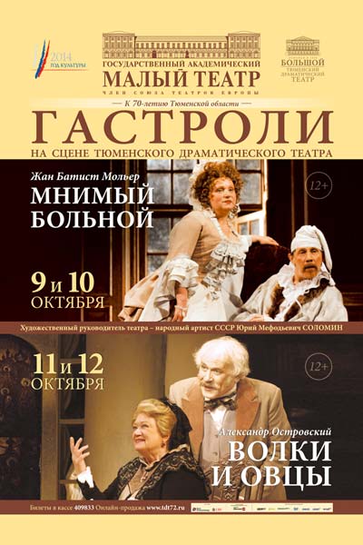 9 и 10 октября, на сцене Тюменского драматического театра, «Мнимый больной»: Е.К.Глушенко, О.Н.Абрамова, Л.В.Титова, В.И.Бочкарев, А.В.Клюквин, Г.В.Подгородинский, Вл.Б.Носик, В.А.Низовой, С.А.Вещев, И.С.Григорьев, А.В.Сергеев, К.М.Юдаев, С.Г.Сошников, Ф.Э.Марцевич, С.И.Видинеев, П.С.Жихарев.