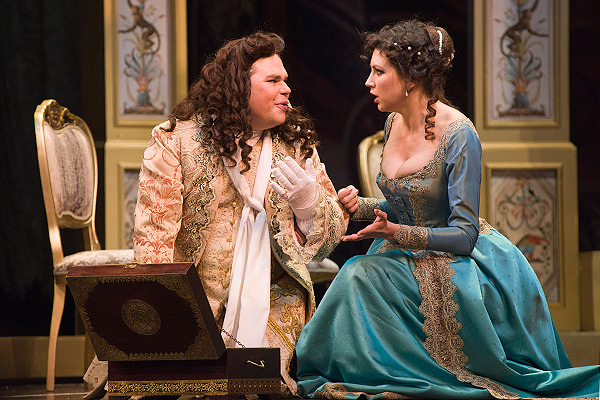 В проработке исторического пространства Малый остается верным своим традициям – точность во всем, вплоть до деталей. Король-солнце (Михаил Мартьянов), как всякий уважающий себя модник того времени, трижды меняет парик. Утром появляясь в черном, днем – в каштановом и вечером – в светлом. Костюмы, к разработке которых приложил руку Вячеслав Зайцев, также в духе времени. За исключение только младший брата короля, чей красный с черным графичным рисунком камзол дает скорее отсыл к комедии дель арте. Что не случайно, ведь герцог Анжуйский предстает на сцене не только как пухлощекий купидон и весельчак. Именно с его легкой руки при дворе появляется комедиант Мольер. В декорациях – столь любимая Людовиком, да и прежними французскими императорами, античная тема с богами. При этом они легко трансформируются то в зал, то в приемную короля, то в оранжерею. И даже искрометная пародия Жоржетты (Дарья Мингазетдинова) на постановки того времени – точное попадание в царивший тогда театр представления.