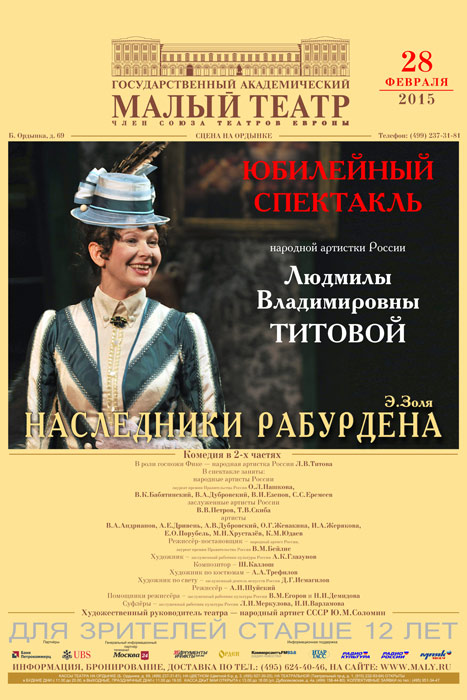 28 февраля комедией Э.Золя «Наследники Рабурдена» Малый театр отметит юбилей народной артистки России Людмилы Титовой. После спектакля, в котором актриса исполняет роль госпожи Фике, Людмилу Владимировну поздравят коллеги и друзья. Начало – в 18:00.