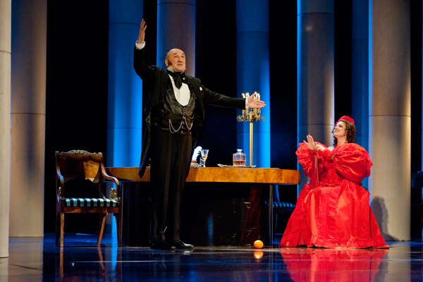 Декорации также отражают вечность классики. Художник Сергей Бархин придумал идеальное решение: вместо навороченных трансформеров он поставил на сцене 20 колонн, словно украденных из античного храма. Или из Хогвартса, ведь они, кажется, живут сами по себе, превращаясь то в интерьеры английского клуба, то в бальную залу дворянской усадьбы, то в уютную спальню. За этими колоннами мог мастерски притаиться коварный Шприх (Владимир Носик), меж них мечется в агонии умирающая от яда Нина (Полина Долинская), они же служат эпичным фоном страшному монологу Неизвестного (Борис Невзоров).
