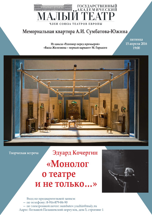 15 апреля приглашаем вас в Мемориальную квартиру А.И.Сумбатова-Южина на встречу с выдающимся театральным художником Эдуардом Кочергиным. Вечер из цикла «Разговор перед премьерой» будет посвящен спектаклю «Васса Железнова – первый вариант» М.Горького, до выпуска которого осталась всего неделя. Начало в 19:00.