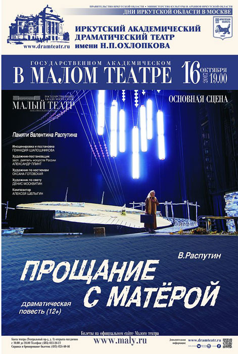 Спектакль «Прощание с Матёрой» по легендарной повести Валентина Распутина в октябре увидят москвичи и гости столицы. Во время празднования Дней Иркутской области, 16 октября, артисты Иркутского академического драматического театра им. Н.П. Охлопкова покажут на сцене Малого театра эту грандиозную и полюбившуюся иркутскому зрителю постановку.