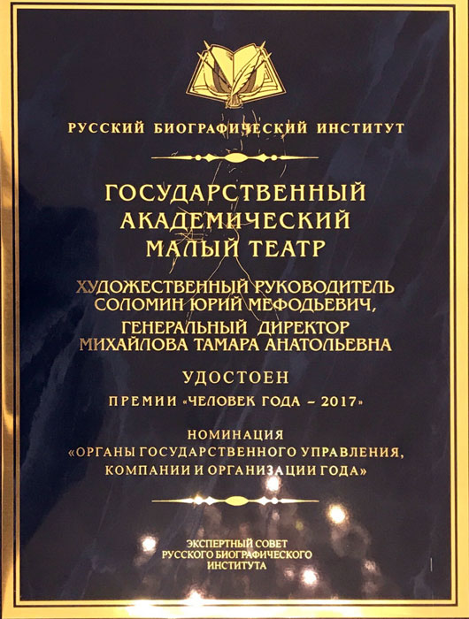 14 декабря 2017 года под сводами Сергиевского зала Храма Христа Спасителя прошла торжественная церемония вручения Национальной премии "Человек года - 2017", организованная Русским биографическим институтом, который исследует современное российское общество сквозь призму деятельности его элиты. В этом году премия была вручена руководству Малого театра – художественному руководителю, народному артисту СССР Юрию Мефодьевичу Соломину и генеральному директору Тамаре Анатольевне Михайловой.