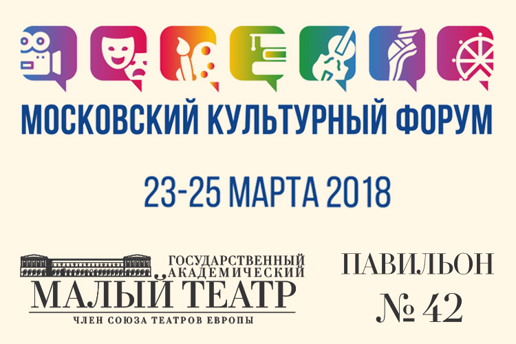 С 23 по 25 марта в Манеже пройдет ставший традиционным Московский культурный форум. Малый театр уже в третий раз будет представлен на нем своим стендом. Программа Форума огромная и разнообразна: концерты, дискуссии, перфомансы и многое другое, все подробности - на официальном сайте. Вход свободный. Ждем вас!