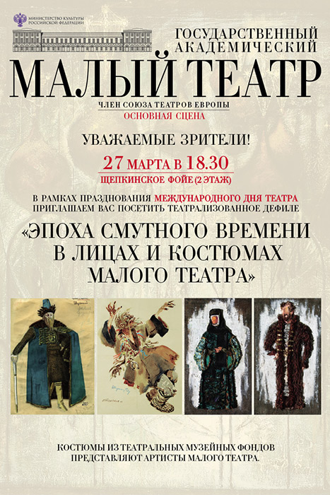 27 марта, в Международный день театра, в Щепкинском фойе состоится театрализованное дефиле. Перед спектаклем «Царь Борис» по заключительной части трилогии А.К. Толстого артисты Малого театра пройдут по подиуму в костюмах из пяти спектаклей, посвященных эпохе Смутного времени.