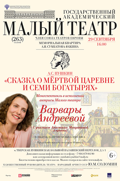 Мемориальная квартира А.И.Сумбатова-Южина открывает новый сезон камерных спектаклей и творческих встреч. Учебный год начался, а значит маленьким зрителям пора в театр. Но отдыхать от уроков надо, конечно, и с удовольствием, и с пользой! А что может быть лучше сказки? Только сказка Александра Сергеевича Пушкина! Ждем вас 29 сентября на моноспектакле "Сказка о мертвой царевне и семи богатырях". Его исполнит актриса Малого театра Варвара Андреева.