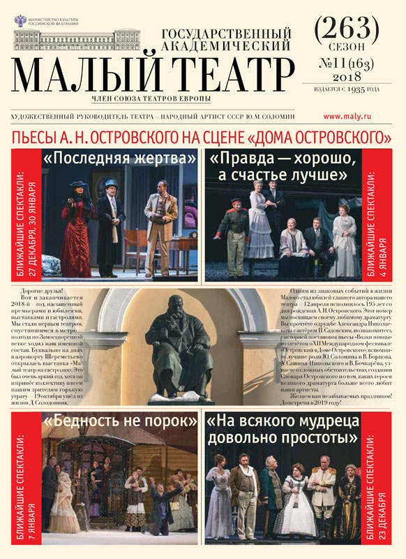 Дорогие друзья! Закончился 2018-й — год, насыщенный премьерами и юбилеями, выставками и гастролями. Мы стали первым театром, спустившимся в метро — полгода по Замоскворецкой ветке ходил наш именной состав. В конце декабря в аэропорту Шереметьево открылась выставка «Малый театр на гастролях». Это был очень яркий год, хотя он и принёс коллективу и всем нашим зрителям горькую утрату — 19 октября ушёл из жизни Д.Солодовник. Одним из знаковых событий в жизни Малого стал юбилей главного автора нашего театра — 12 апреля исполнилось 195 лет со дня рождения А.Н.Островского. Последний в ушедшем году номер нашей газеты мы посвятили своему любимому драматургу. Вы прочтёте о дружбе Александра Николаевича с актёром П.Садовским, познакомитесь с историей постановок пьесы «Волки и овцы» и с отчётом о XII Международном фестивале «Островский в Доме Островского», вспомни те лучшие роли Ю.Соломина и В.Борцова, А.Сашина-Никольского и В.Бочкарёва, узнаете о сложных обстоятельствах создания Словаря Островского и о том, каких героев великого драматурга больше всего любят наши артисты.