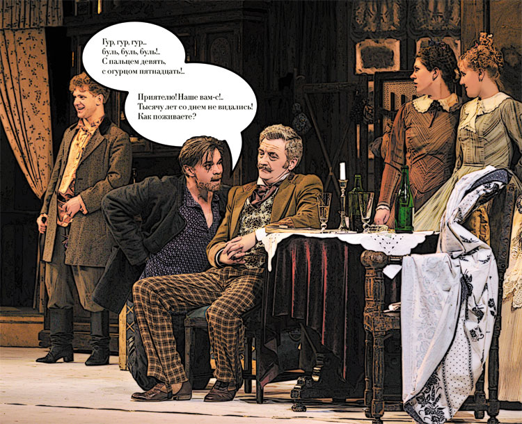 Любим Карпыч. Гур, гур, гур... буль, буль, буль!.. С пальцем девять, с огурцом пятнадцать!.. Приятелю! (Протягивает руку Коршунову.) Наше вам-с!.. Тысячу лет со днём не видались! Как поживаете?