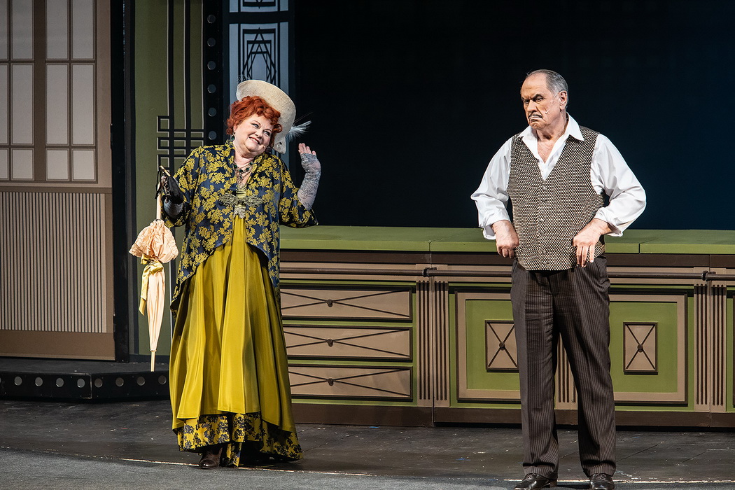 В начале спектакля рассказчик объясняет: в 1935 году был написан фарс Оксенфорда, в 1938 появилась адаптация Уайлдера, а в 1969 году на экране вышел знаменитый фильм с Барбарой Стрейзанд, и наконец, 2019 год - спектакль "Всегда зовите Долли!". Постепенно оживает массовка в ярких платьях и париках, подготавливая зрительный зал к выходу на сцену главной актрисы.