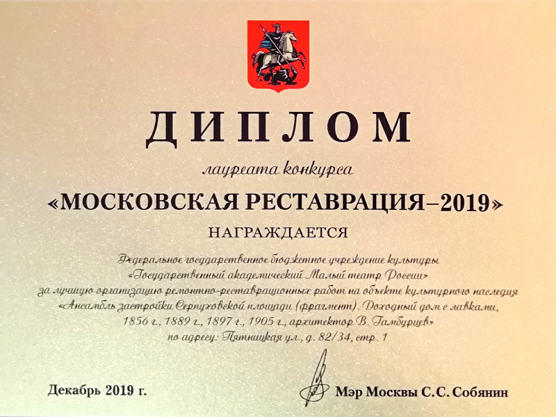 Спешим сообщить вам, что Малый театр стал лауреатом конкурса Правительства Москвы «Московская реставрация – 2019» за лучшую организацию ремонтно-реставрационных работ на объекте культурного наследия «Ансамбль застройки Серпуховской площади (фрагмент), доходный дом с лавками 1856 год, 1889 год, 1897 год, 1905 год, архитектор — В.А. Гамбурцев», находящийся по адресу: Пятницкая улица, дом 82/34, строение 1.