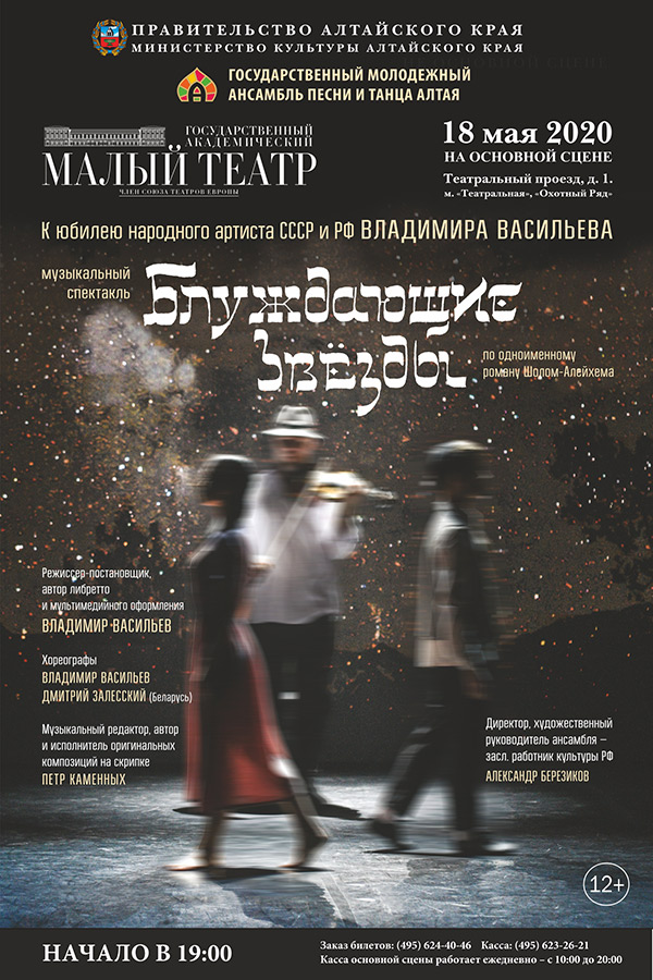 18 мая на основной сцене Малого театра будет показан музыкальный спектакль «Блуждающие звезды» по мотивам одноимённого романа Шолом Алейхема в постановке народного артиста СССР Владимир Васильева.
