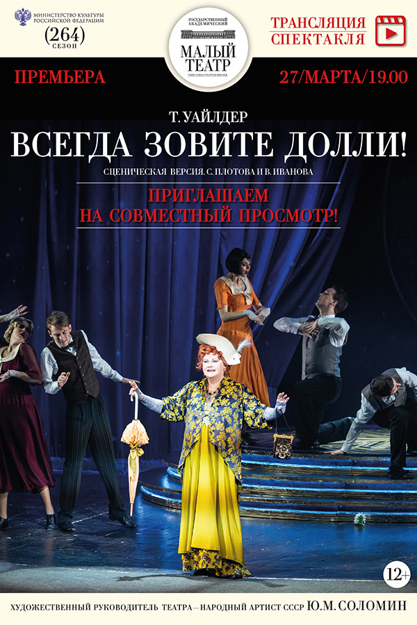 Малый театр готовит для вас подарок к Международному дню театра: 27 марта на официальной странице Малого в Faсebook пройдет трансляция одного из самых ярких спектаклей последних сезонов – «Всегда зовите Долли!» Торнтона Уайлдера. В главных ролях – народные артисты России Ирина Муравьева и Валерий Афанасьев.