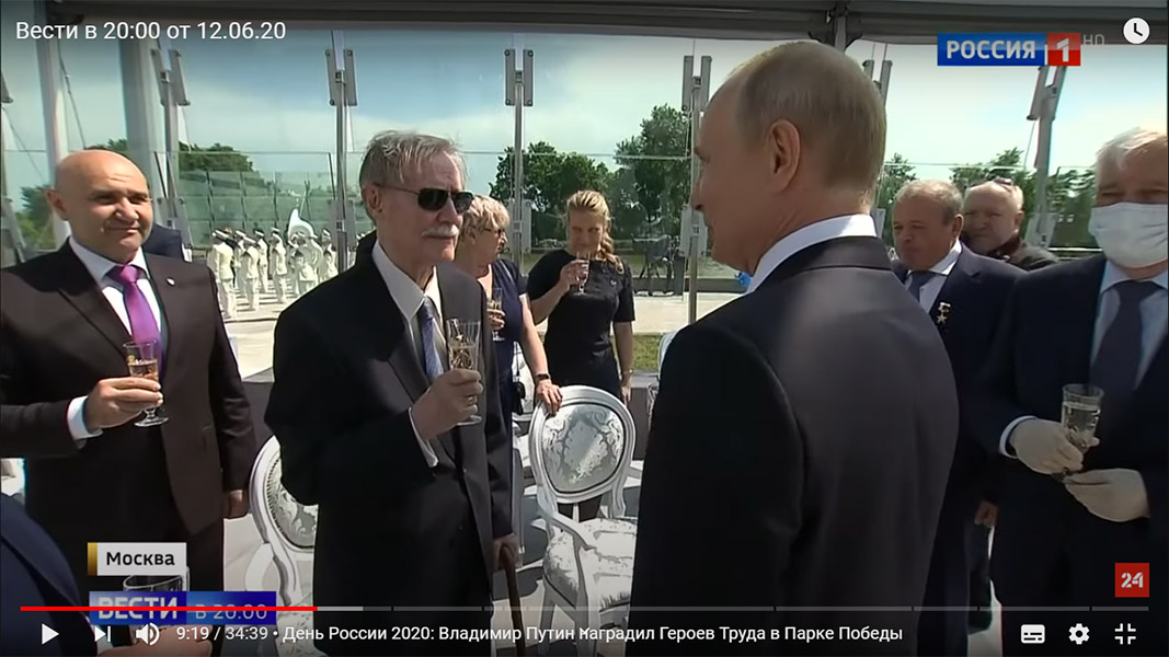 После церемонии вручения медалей Героя Труда в пятницу на Поклонной горе в Москве президент подошел с бокалом шампанского к худруку театра Юрию Соломину. Артист поздравил президента с Днем России.