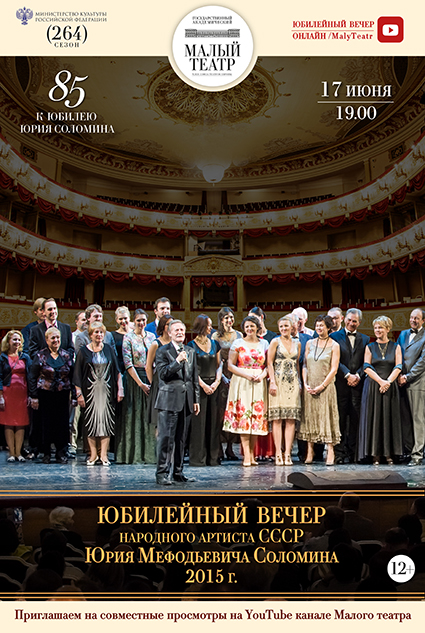 Приглашаем вас посмотреть запись юбилейного вечера Юрия Соломина, который проходил пять лет назад в честь его 80-летия. Труппа, коллеги и друзья устроили для юбиляра большой праздник. Малый театр, сцена на Ордынке, 20 июня 2015 года.
