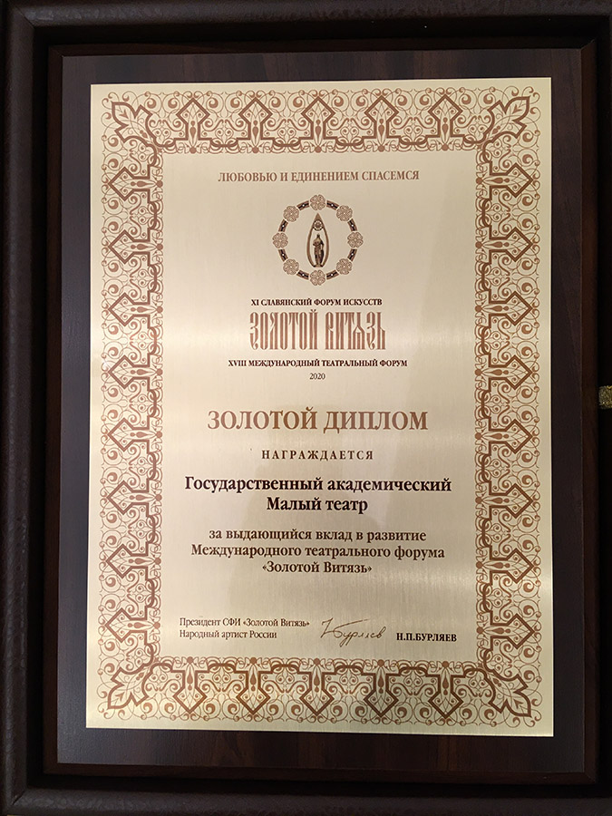 Поздравляем весь коллектив Малого театра с присуждением Золотого диплома за выдающийся вклад в развитие Международного театрального форума "Золотой Витязь". Диплом подписан президентом форума народным артистом России Николаем Бурляевым.