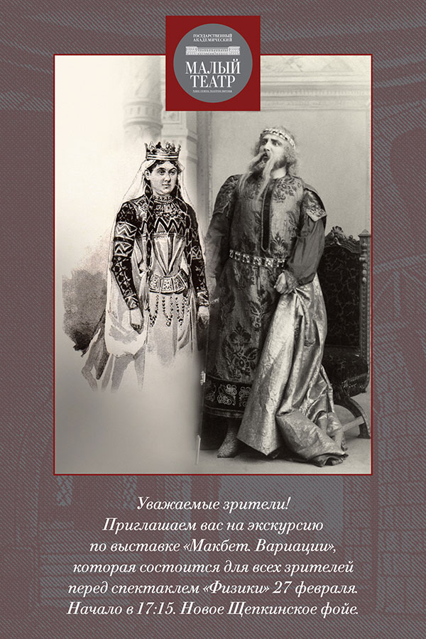 Дорогие друзья! Приглашаем вас на экскурсию по выставке «Макбет. Вариации», которая состоится для всех зрителей спектакля «ФИЗИКИ» Ф.Дюрренматта 27 февраля. Начало в 17:15. Новое Щепкинское фойе.