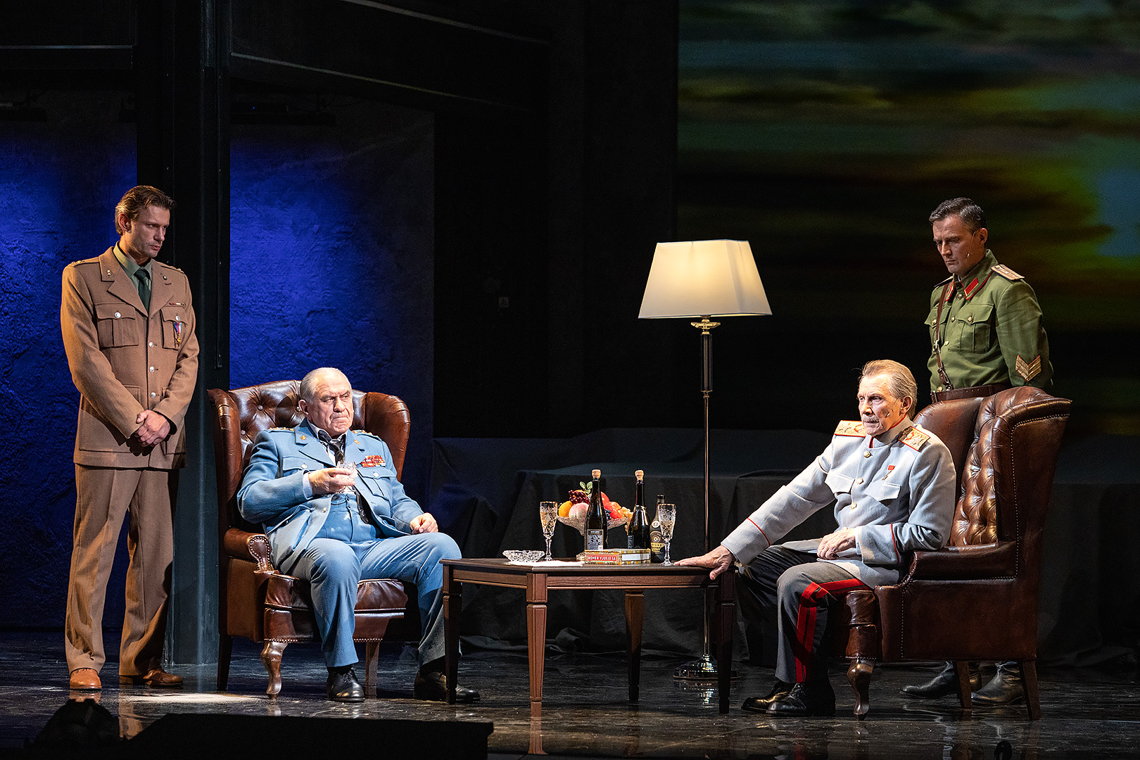 – Вот и меня заинтересовала драматургия не видимого никому закулисного мира тяжёлых переговоров в Ялте, которые, оказывается, не раз заходили в тупик, но три великих политика продолжали искать решения. Шла адская работа трёх сложных личностей, на грани срыва. Сталин (Василий Бочкарёв), Рузвельт (Владимир Носик), Черчилль (Валерий Афанасьев) – неоднозначные персонажи. Это уставшие, больные, пожилые люди, которые взвалили на себя ответственность решать судьбу мира. И на сцене нет монстров – так я сказал актёрам. Мы искали мотивацию каждого персонажа. Здесь сплелась история стран и история страстей. Актёры играют без грима, очень тонко работая с потоком сознания героев. Хотелось зафиксировать хрупкость мира, скоротечность человеческой жизни. Ведь наш земной шарик из космоса такой маленький, а столько оружия человечеством накоплено, что раскачать наш мир до новой катастрофы ничего не стоит…
