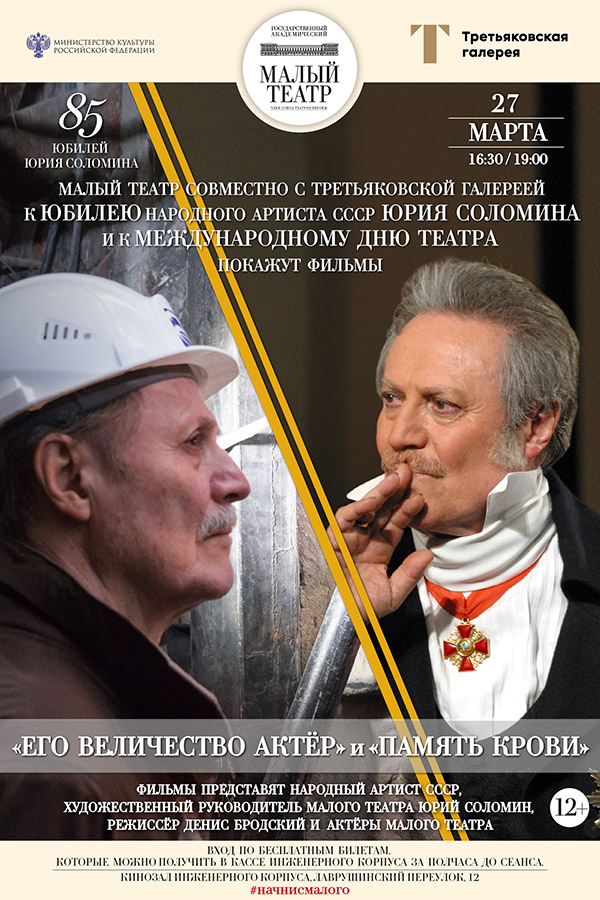 Малый театр совместно с Третьяковской галереей 27 марта, к юбилею Народного артиста СССР Юрия Соломина и к Всемирному дню театра покажут фильмы «Его Величество Актёр» и «Память крови». Показы пройдут в Инженерном корпусе Третьяковской галереи. Начало в 16:30 и в 19:00. А в 14:00 состоится показ уникальных документальных материалов о Малом театре из коллекции Российского архива кино и фото документов.