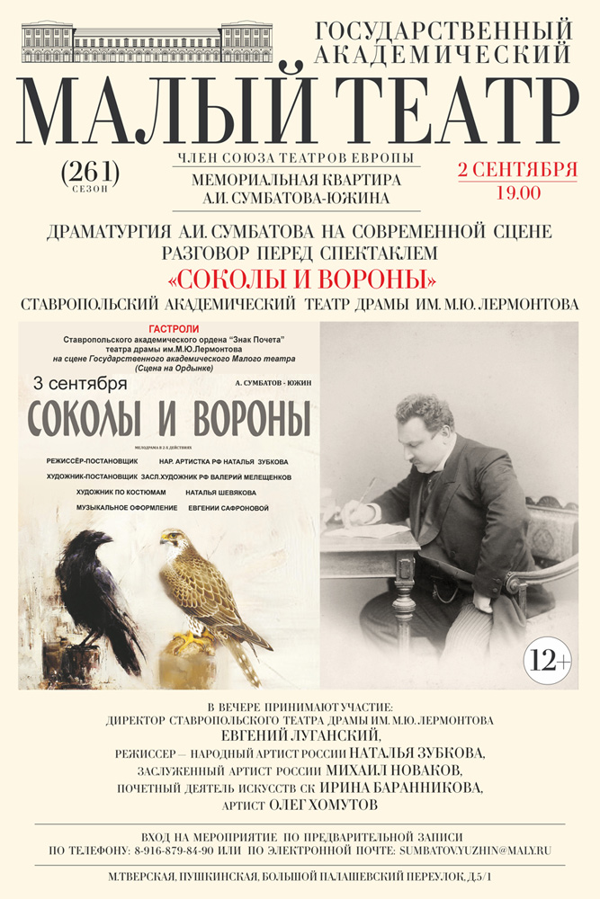 3 и 4 сентября 2016 года на сцене на Ордынке Малого театра состоятся гастроли Ставропольского академического театр драмы им. М.Ю. Лермонтова. Первый спектакль – премьера театра, пьеса «Соколы и вороны» А.И. Сумбатова. Малый театр не мог пройти мимо такого события – постановки на современной сцене пьесы драматурга, актера и руководителя Малого театра Александра Ивановича Сумбатова-Южина. Мы приглашаем наших зрителей на разговор с актерами, режиссером и руководителем Ставропольского театра драмы в Мемориальную квартиру А.И. Сумбатова-Южина.