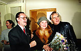 Евгения Глушенко в сопровождении Д.Фаддеева и А.Жулина Евгению Глушенко встречают актёры Малого театра. Евгения Глушенко на служебном подъезде в день празднования своего юбилея. Юрий Соломин и Виктор Коршунов встречают Евгению Глушенко у гримёрки.